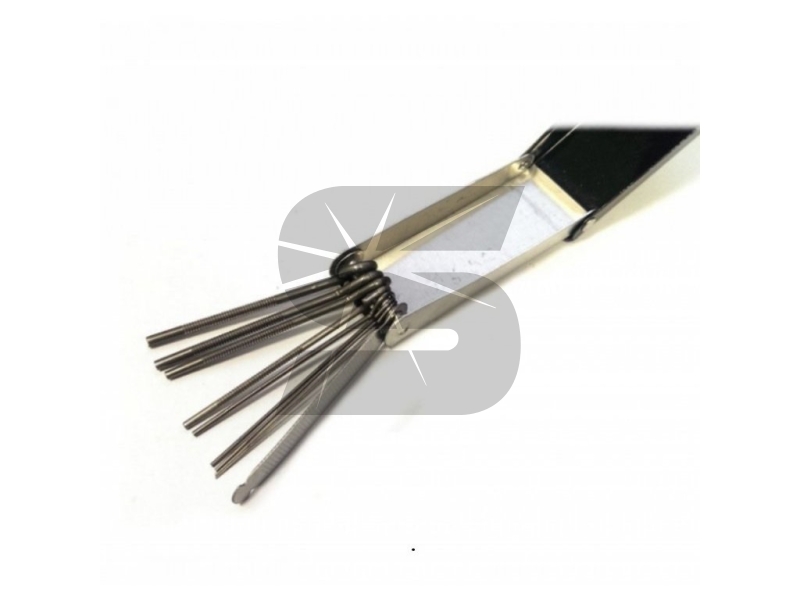 Sada čistících drátků pro čištění svařovacích hubic. Set obsahuje 9 drátků různých průměrů, které jsou ideální pro čištění všech typů hubic.
