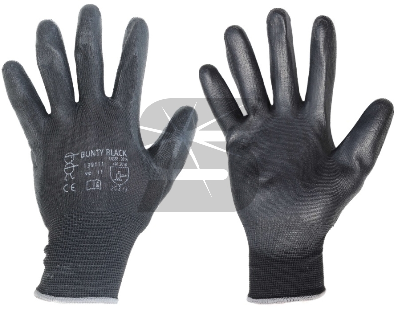 Černé bezešvé rukavice BUNTY ze 100% polyesteru, velikost 6, polomáčené v polyuretanu s velmi dobrou hmatovou citlivostí.