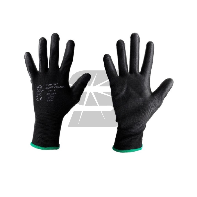 Černé bezešvé rukavice BUNTY ze 100% polyesteru, velikost 8, polomáčené v polyuretanu s velmi dobrou hmatovou citlivostí.