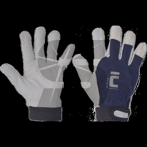 Pracovní rukavice PELICAN BLUE ve velikosti 9 jsou šité z jemné lícové ovčí kůže na dlani a modré bavlněné tkaniny na hřbetu s manžetou na suchý zip.