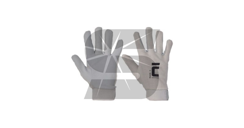 Pracovní rukavice PELICAN PLUS ve velikosti 10 šité z jemné lícové ovčí kůže v dlani, bílé bavlněné tkaniny na hřbetu a s nápletem.