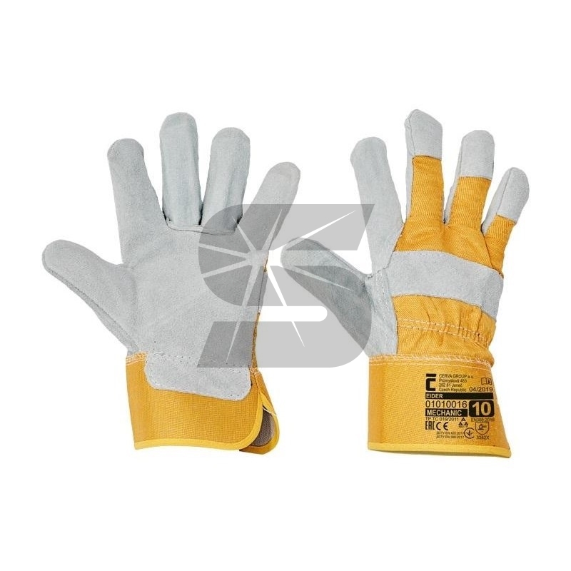 Pracovní rukavice EIDER žluté ve velikosti 10 z hovězí štípenky v dlani s podšívkou, bavlněné tkaniny na hřbetu, celokoženými palci.