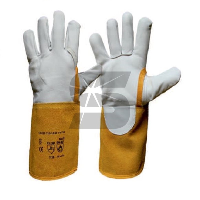 Svářečské rukavice TIGER LEO ve velikosti 9 jsou rukavice odolné proti teplu, slouží k ochraně rukou proti mechanickým rizikům. Jsou šité z bílé lícové kozinky, kevlarovou nití, bez podšívky.