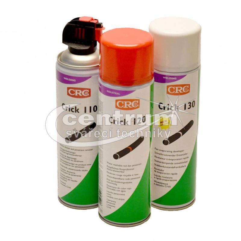 Povrch nejdříve odmastit a očistit CRC CRICK 110, nanést slabou vrstvu CRICK 120 a nechat 10-20 min zaschnout, s použitím hadry, vody nebo CRICK 110 odstranit veškeré viditelné zbytky, aplikovat tenkou homogenní vrstvu produktu CRICK 130 ze vzdálenosti cca 20cm - nechat cca 7 min působit, zkontrolovat povrch – trhliny se zobrazí jako červené tečky a čárky na bílém podkladu, rychlost zobrazení a velikost je závislá na velikosti trhliny.