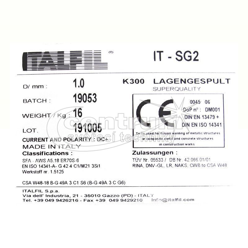 • Pro svařování v ochranném plynu, který odpovídá normě EN440 G3Si1, AWS A5.18 ER70S-6.